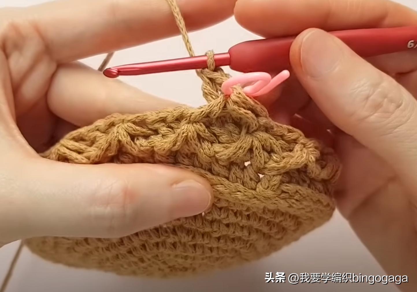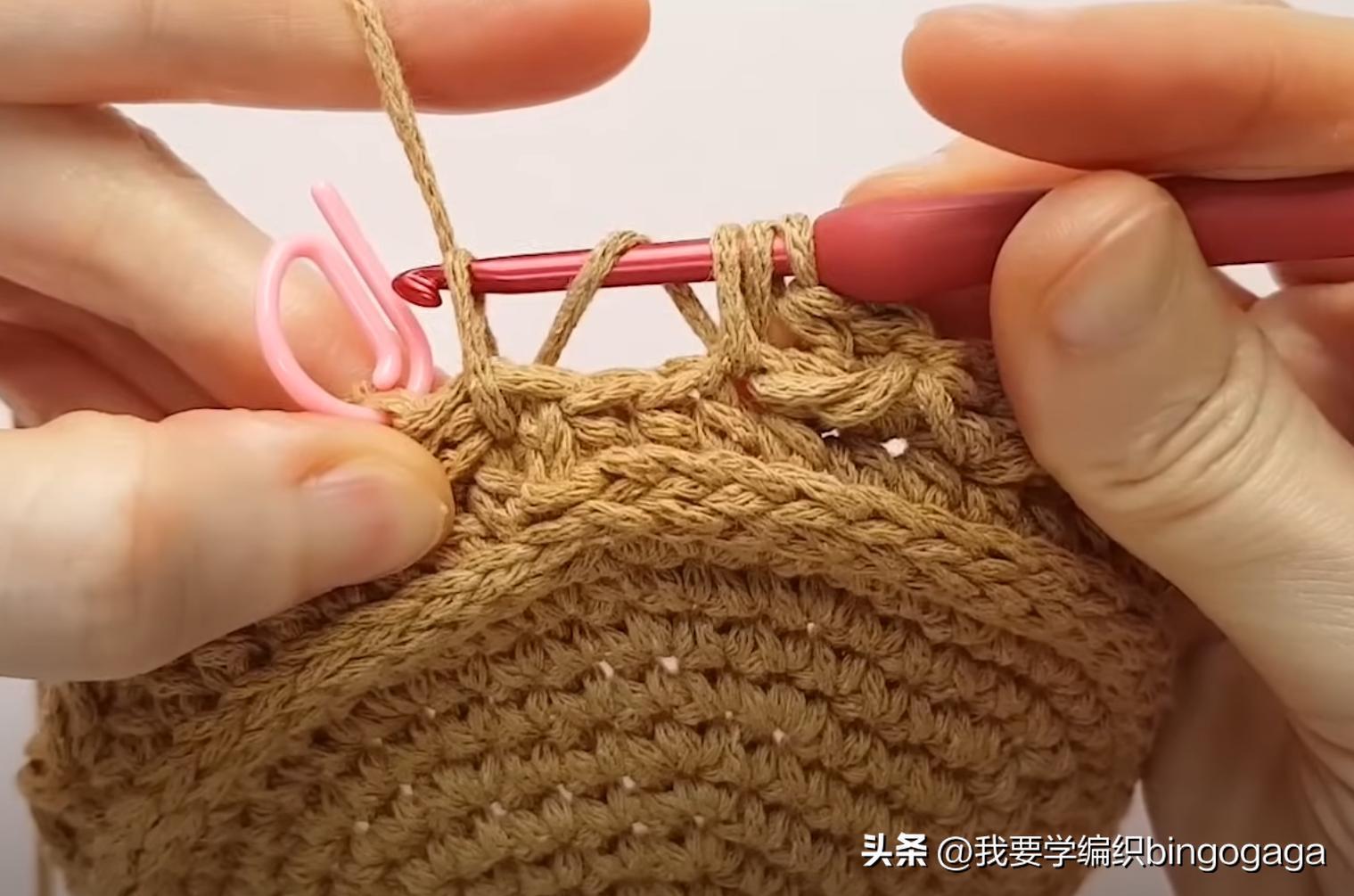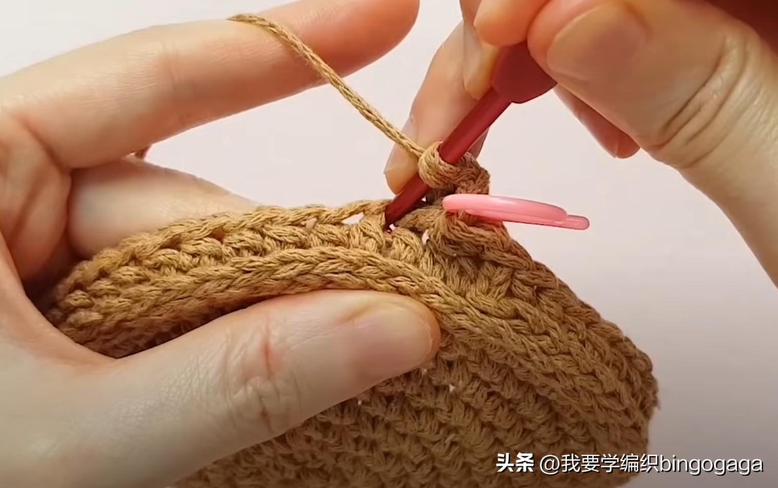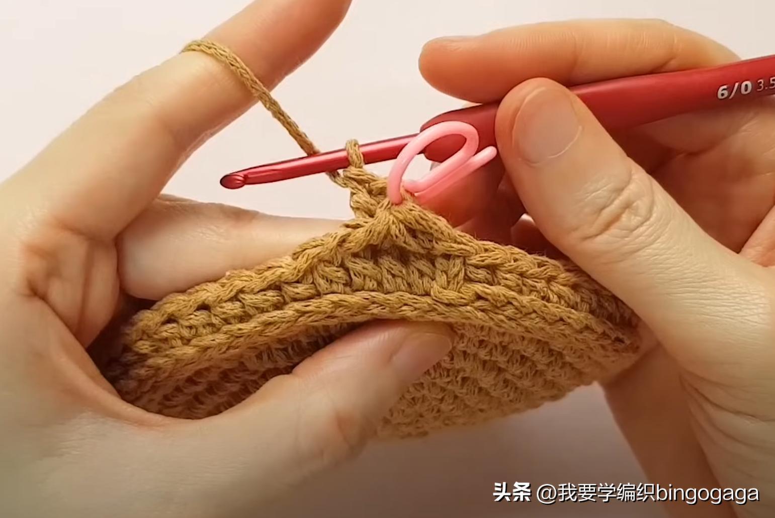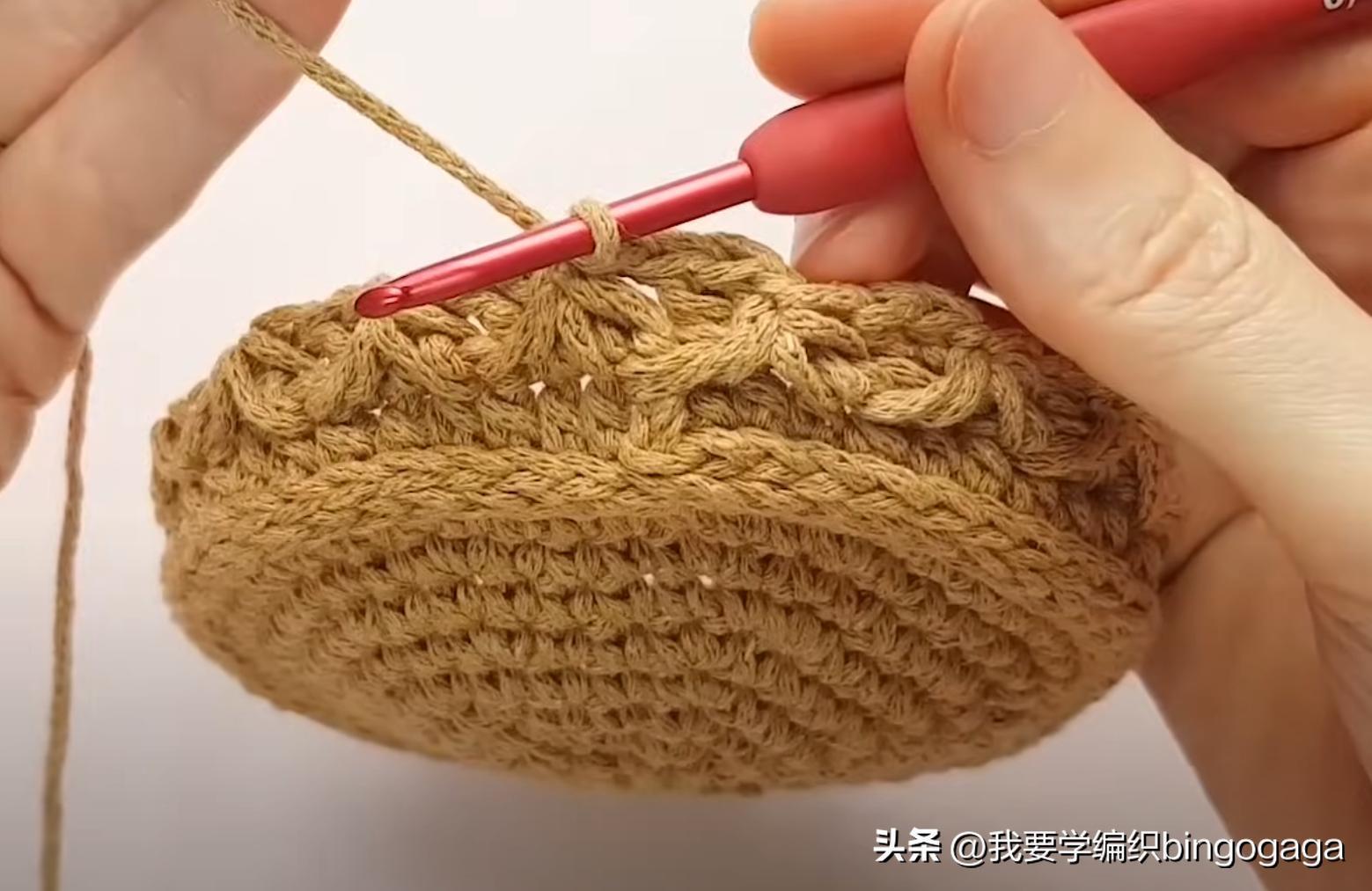 先从包底起钩。第1圈:环起,6短(不引拔,环钩,每圈第1针上加上记号扣);第2圈:每针上钩2短*6,12针;第3圈:隔1加1,(1,1放2)*6,18短;第4圈:隔2加1,(1,1放2,1)*6,24短;第5圈:(3个1,1放2)*6,30短;第6圈:(2个1,1放2,2个1)*6,36短;第7圈:(5个1,1放2)*6,42短;第8圈:(3个1,1放2,3个1)*6,48短;第9圈:(7个1,1放2)*6,54短;第10圈:挑后半针钩一圈引拔针;第11圈:挑辫子针后面的小横杠钩一圈引拔针。