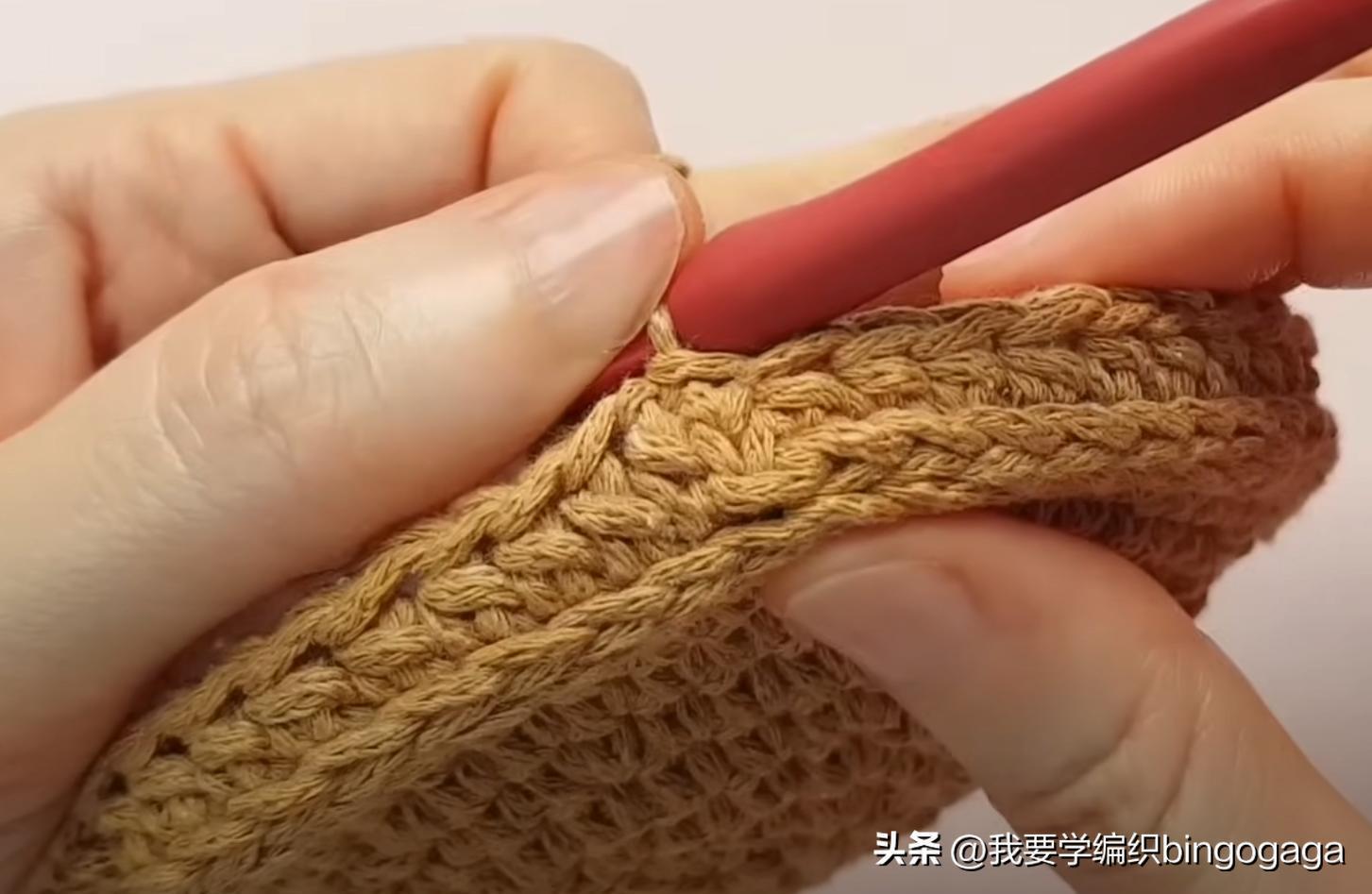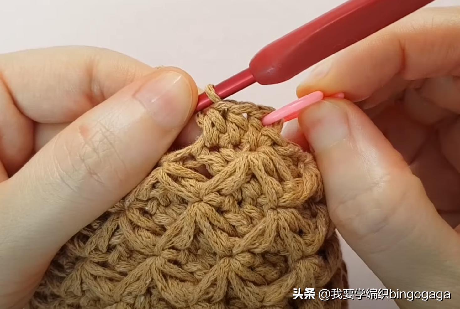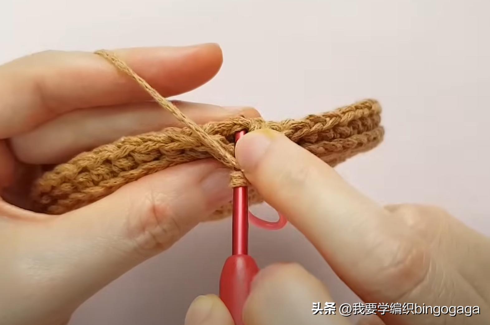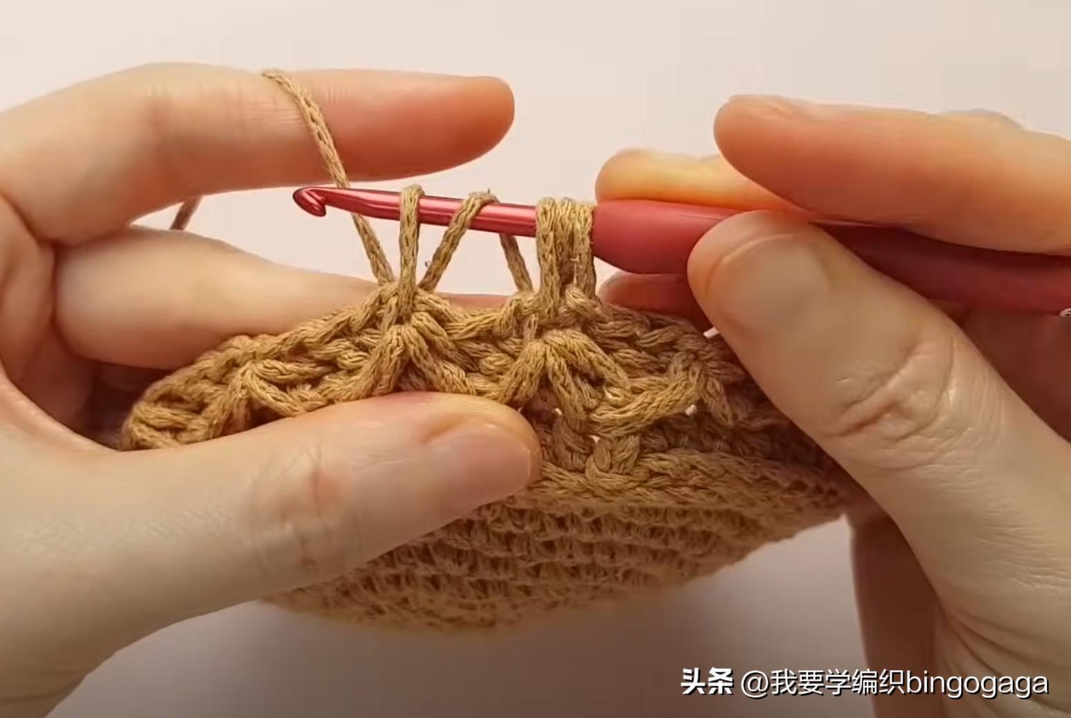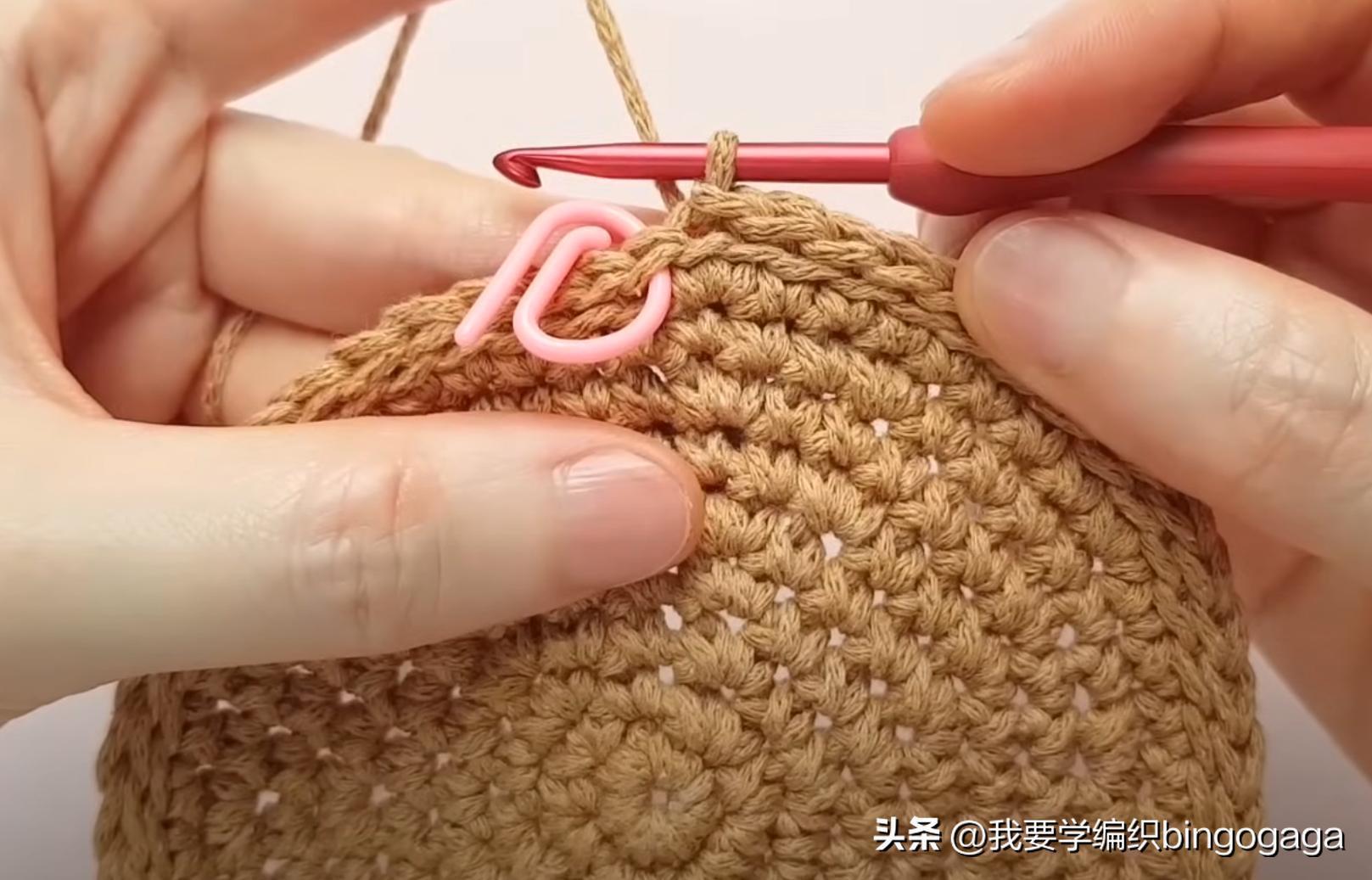 先从包底起钩。第1圈:环起,6短(不引拔,环钩,每圈第1针上加上记号扣);第2圈:每针上钩2短*6,12针;第3圈:隔1加1,(1,1放2)*6,18短;第4圈:隔2加1,(1,1放2,1)*6,24短;第5圈:(3个1,1放2)*6,30短;第6圈:(2个1,1放2,2个1)*6,36短;第7圈:(5个1,1放2)*6,42短;第8圈:(3个1,1放2,3个1)*6,48短;第9圈:(7个1,1放2)*6,54短;第10圈:挑后半针钩一圈引拔针;第11圈:挑辫子针后面的小横杠钩一圈引拔针。