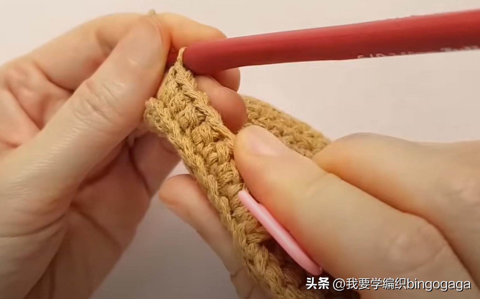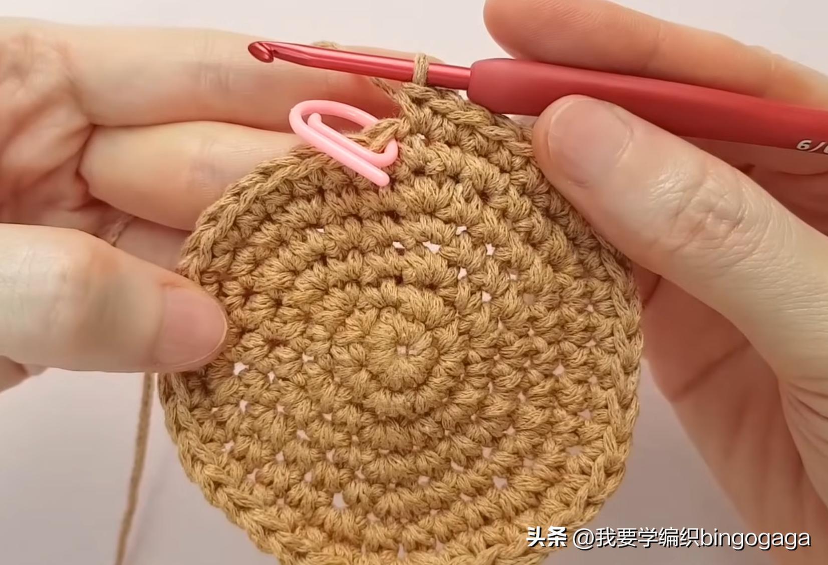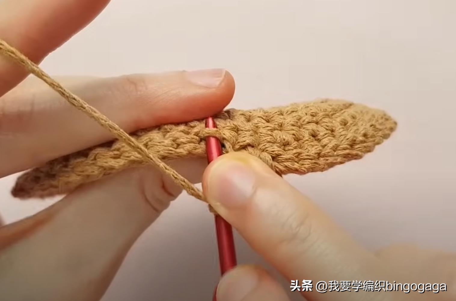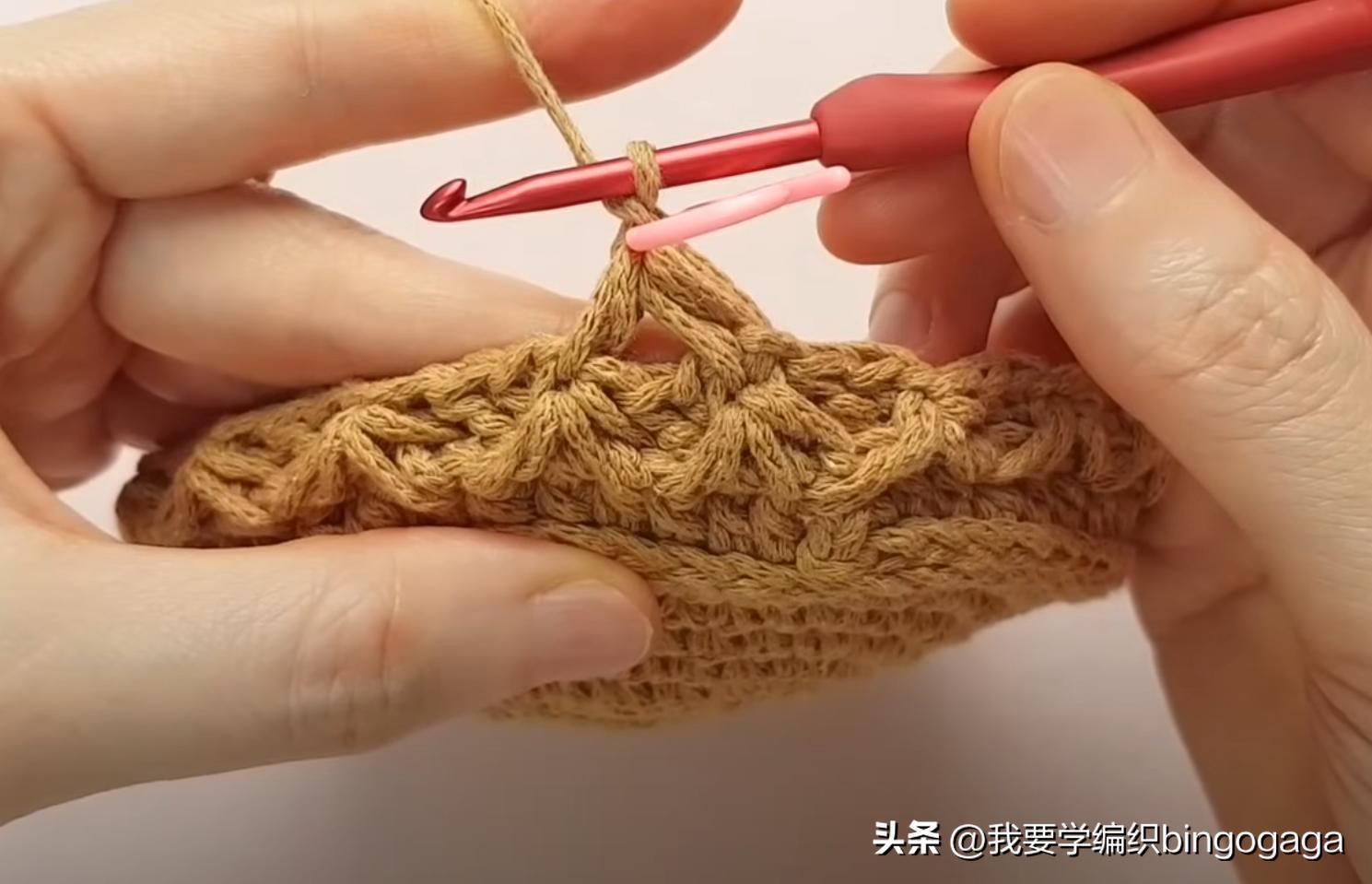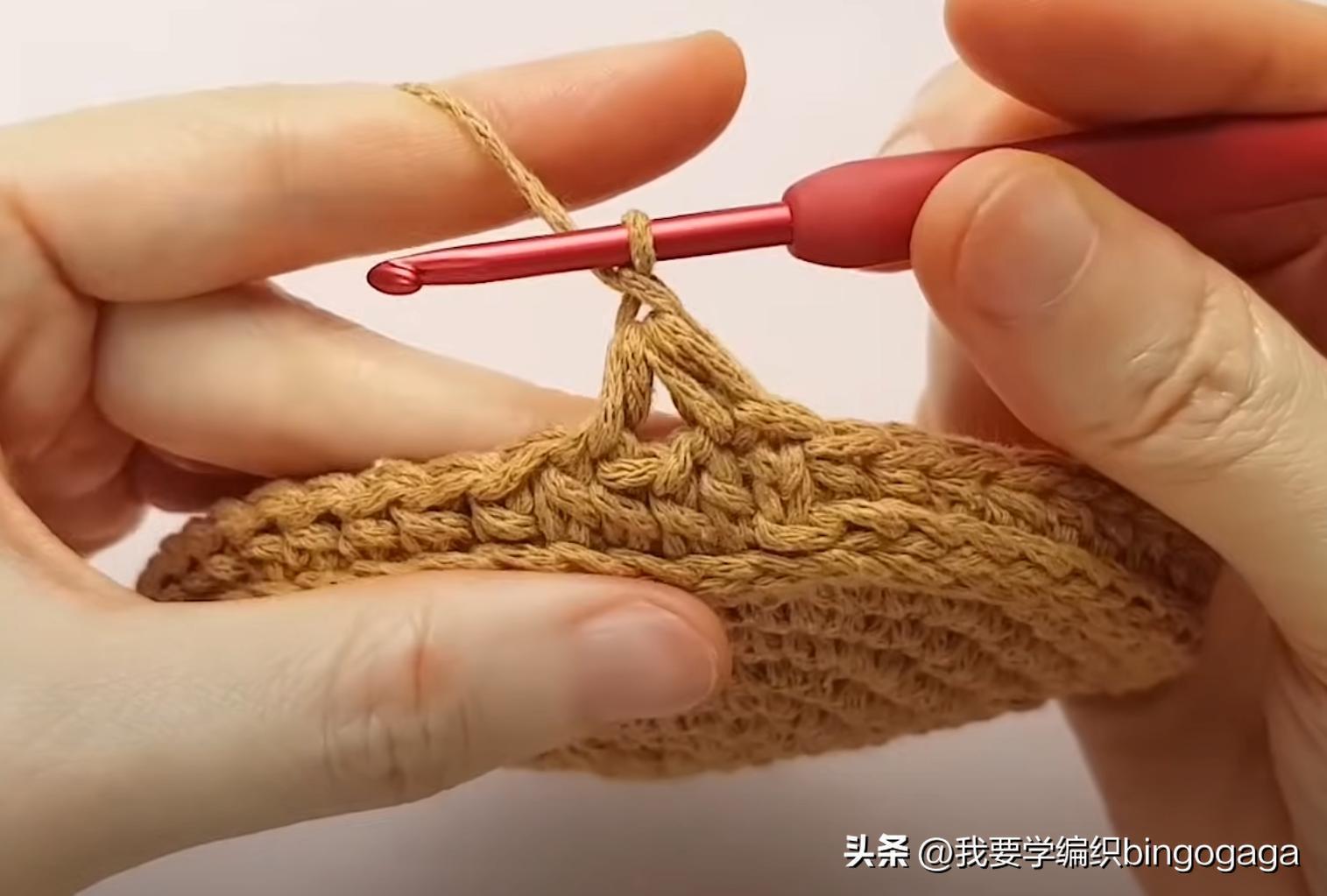 先从包底起钩。第1圈:环起,6短(不引拔,环钩,每圈第1针上加上记号扣);第2圈:每针上钩2短*6,12针;第3圈:隔1加1,(1,1放2)*6,18短;第4圈:隔2加1,(1,1放2,1)*6,24短;第5圈:(3个1,1放2)*6,30短;第6圈:(2个1,1放2,2个1)*6,36短;第7圈:(5个1,1放2)*6,42短;第8圈:(3个1,1放2,3个1)*6,48短;第9圈:(7个1,1放2)*6,54短;第10圈:挑后半针钩一圈引拔针;第11圈:挑辫子针后面的小横杠钩一圈引拔针。