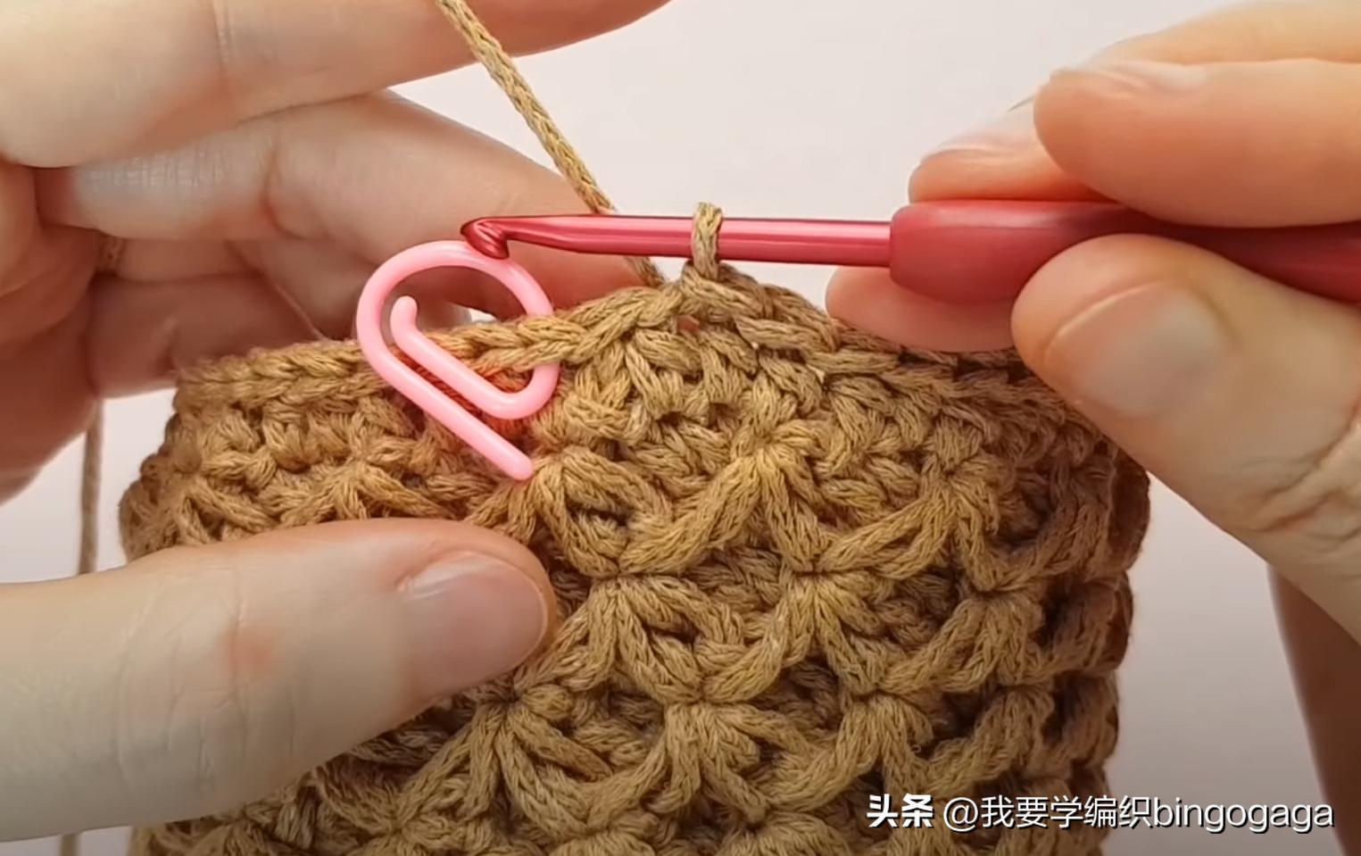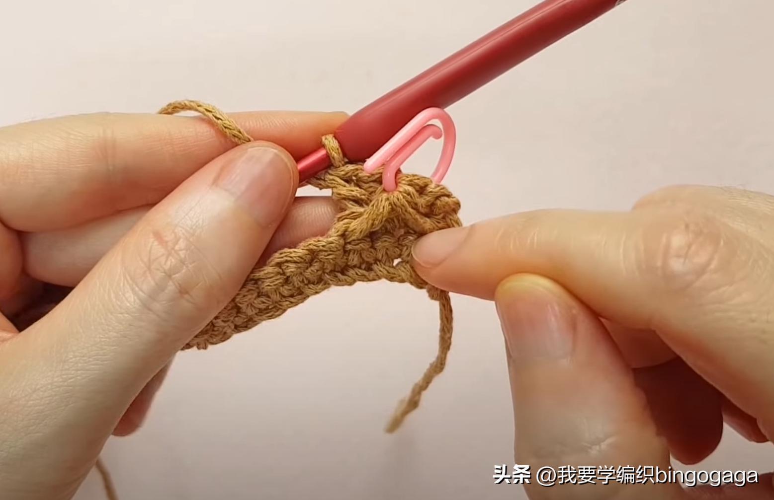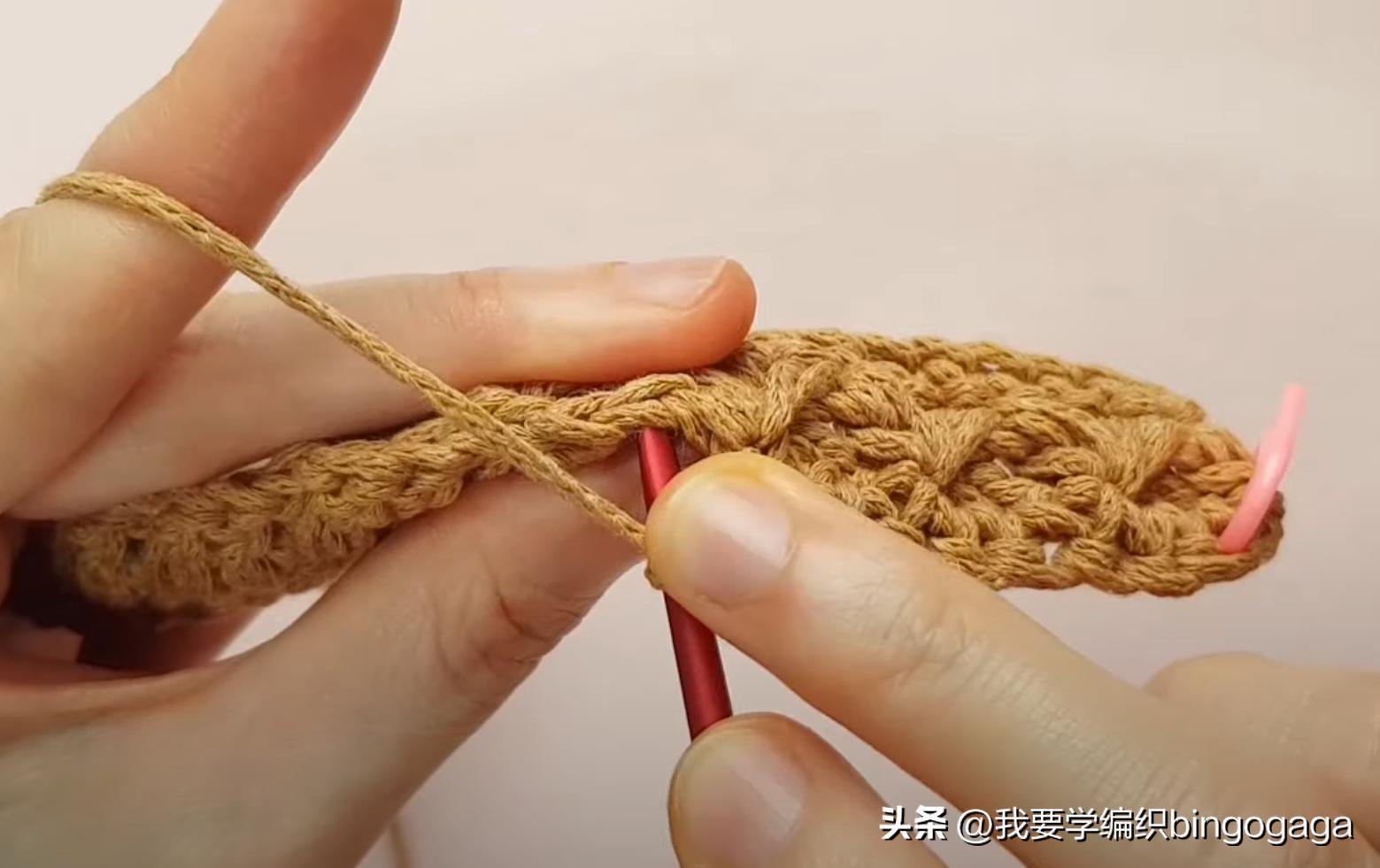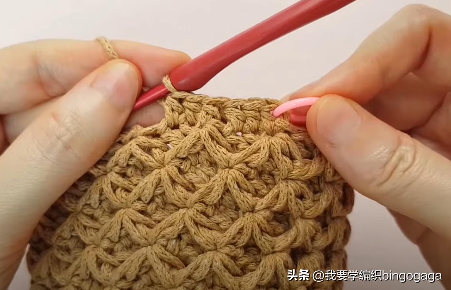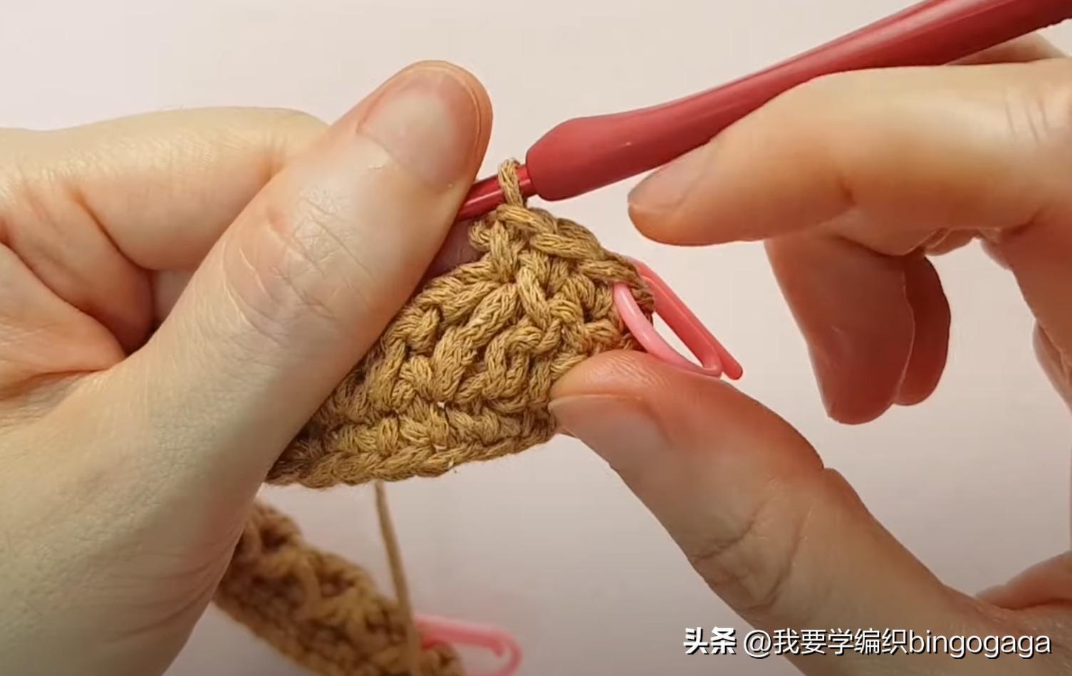 先从包底起钩。第1圈:环起,6短(不引拔,环钩,每圈第1针上加上记号扣);第2圈:每针上钩2短*6,12针;第3圈:隔1加1,(1,1放2)*6,18短;第4圈:隔2加1,(1,1放2,1)*6,24短;第5圈:(3个1,1放2)*6,30短;第6圈:(2个1,1放2,2个1)*6,36短;第7圈:(5个1,1放2)*6,42短;第8圈:(3个1,1放2,3个1)*6,48短;第9圈:(7个1,1放2)*6,54短;第10圈:挑后半针钩一圈引拔针;第11圈:挑辫子针后面的小横杠钩一圈引拔针。