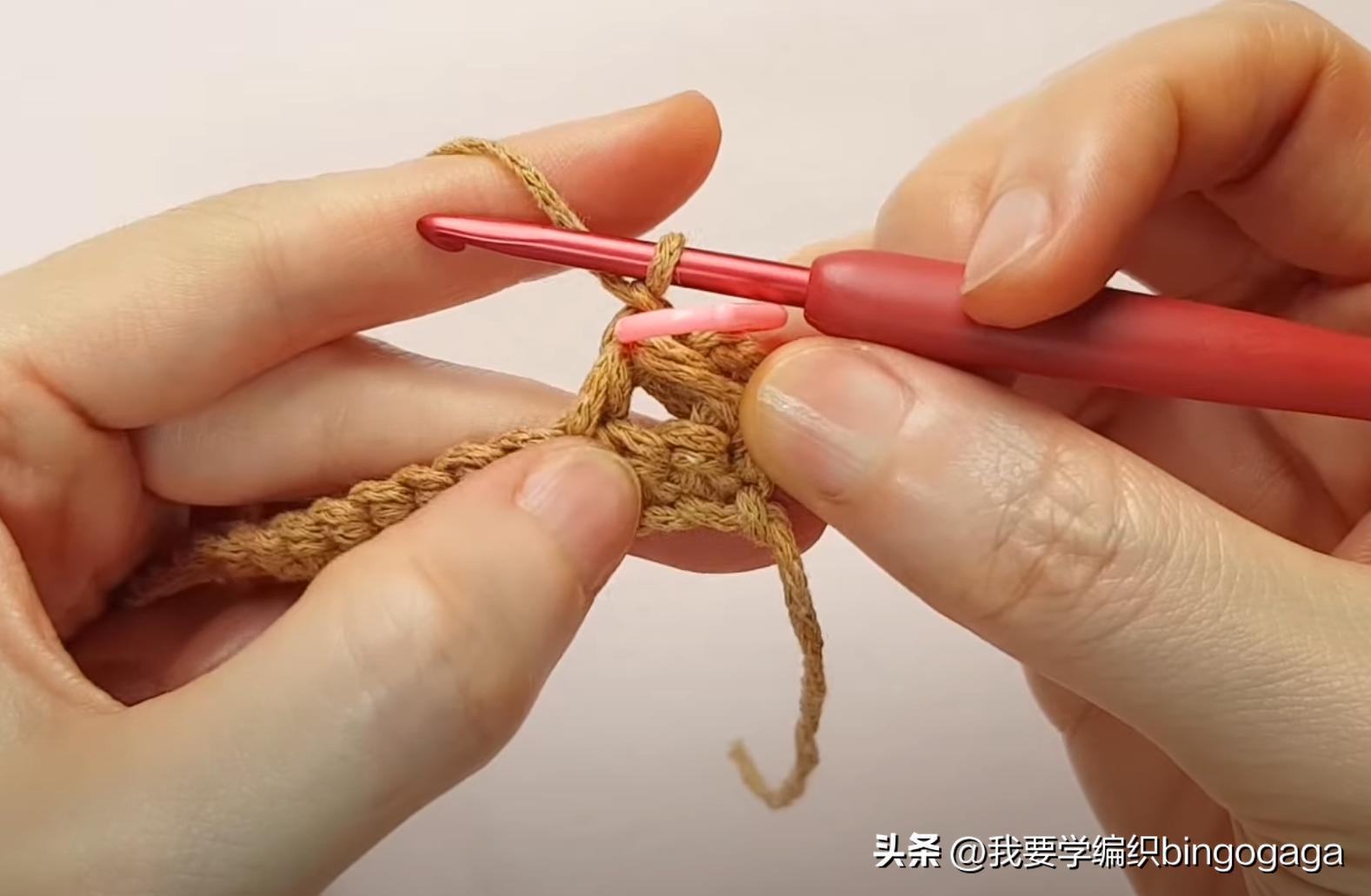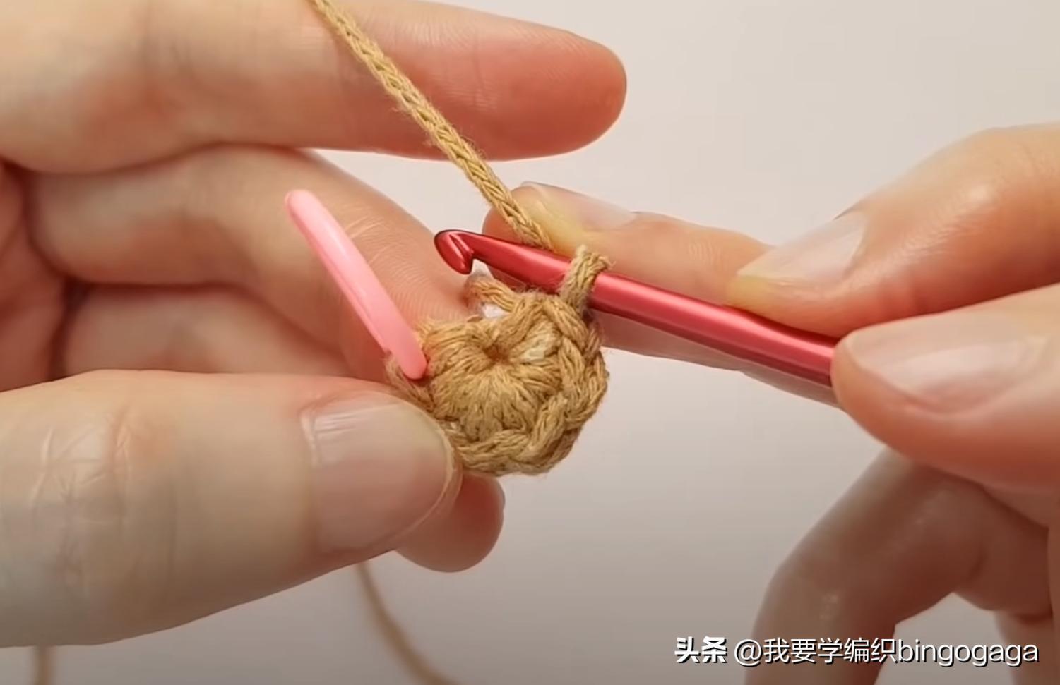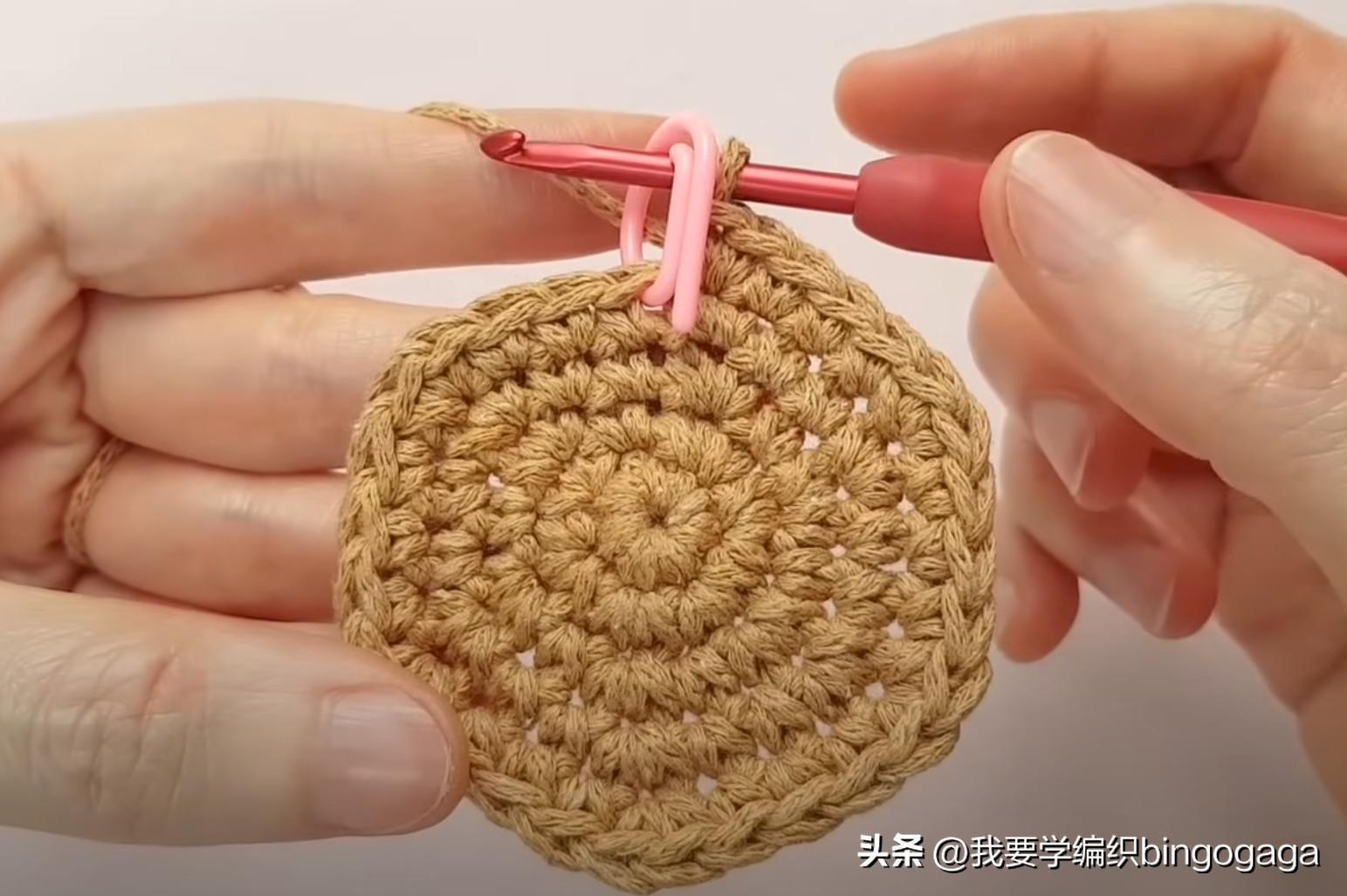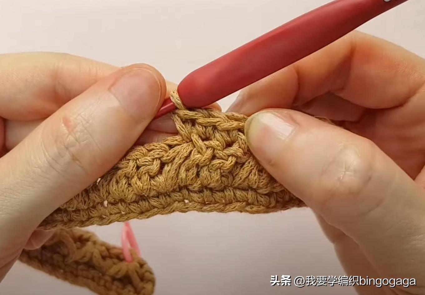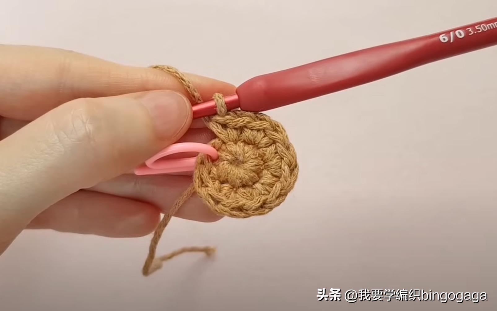 先从包底起钩。第1圈:环起,6短(不引拔,环钩,每圈第1针上加上记号扣);第2圈:每针上钩2短*6,12针;第3圈:隔1加1,(1,1放2)*6,18短;第4圈:隔2加1,(1,1放2,1)*6,24短;第5圈:(3个1,1放2)*6,30短;第6圈:(2个1,1放2,2个1)*6,36短;第7圈:(5个1,1放2)*6,42短;第8圈:(3个1,1放2,3个1)*6,48短;第9圈:(7个1,1放2)*6,54短;第10圈:挑后半针钩一圈引拔针;第11圈:挑辫子针后面的小横杠钩一圈引拔针。