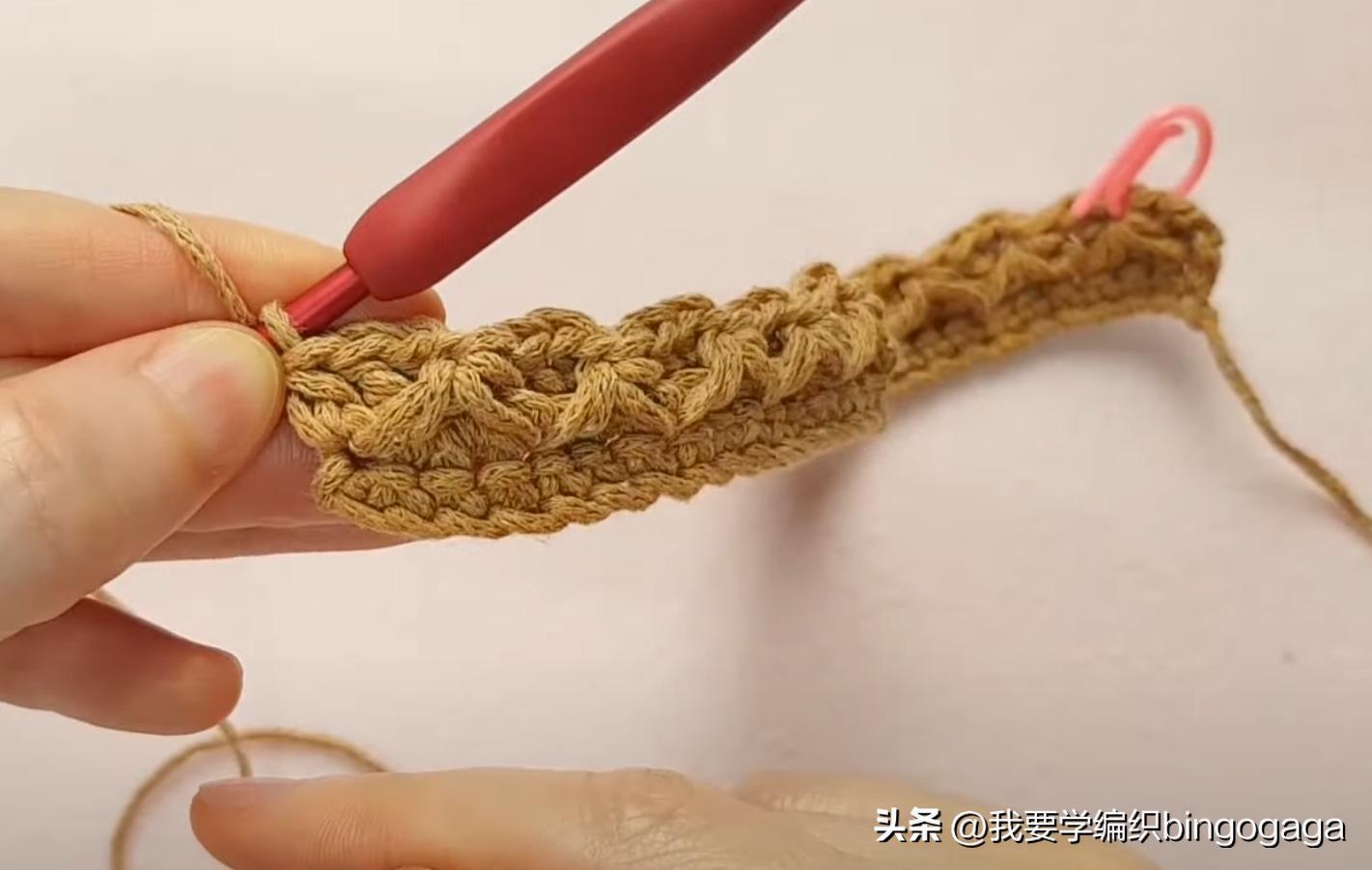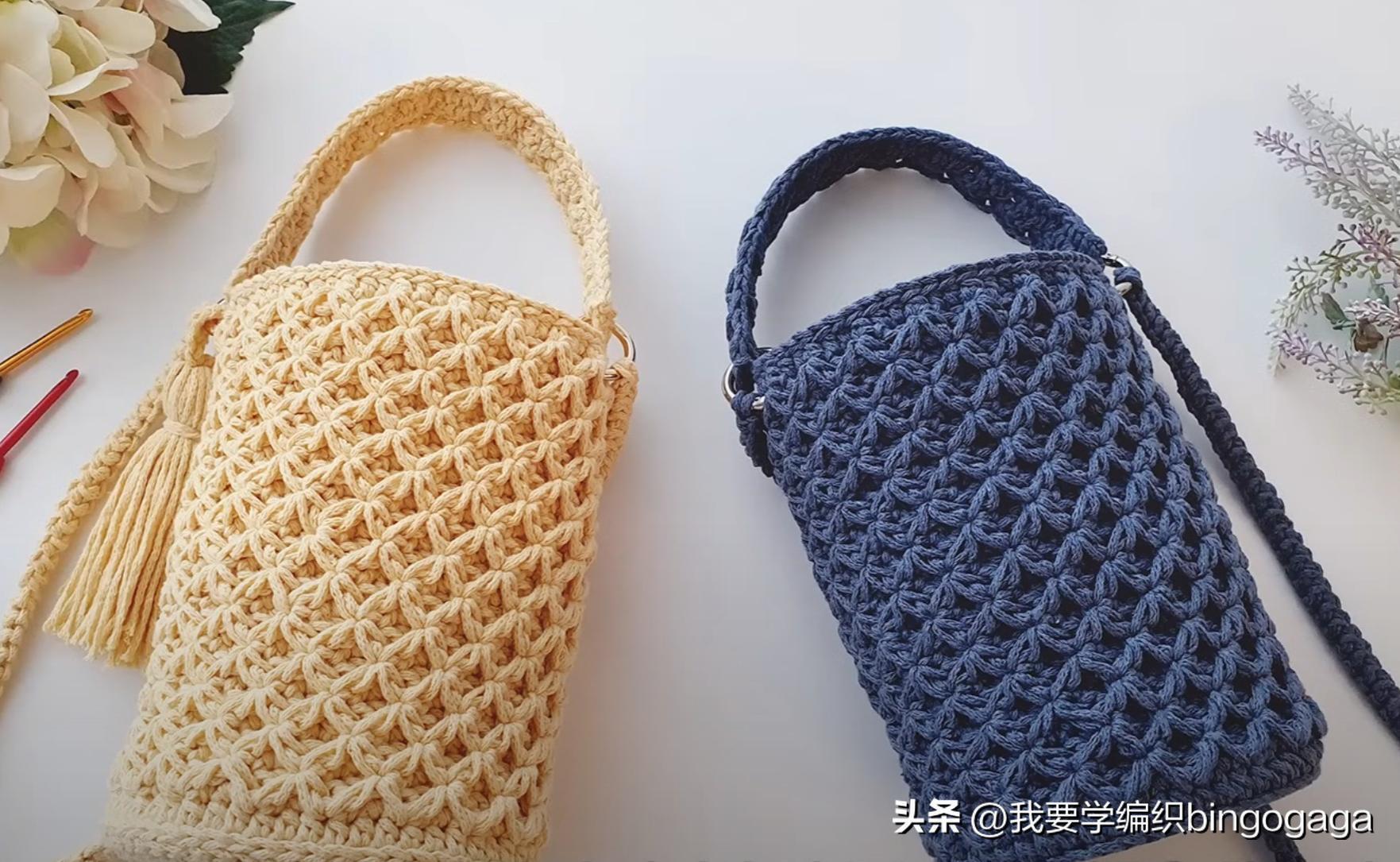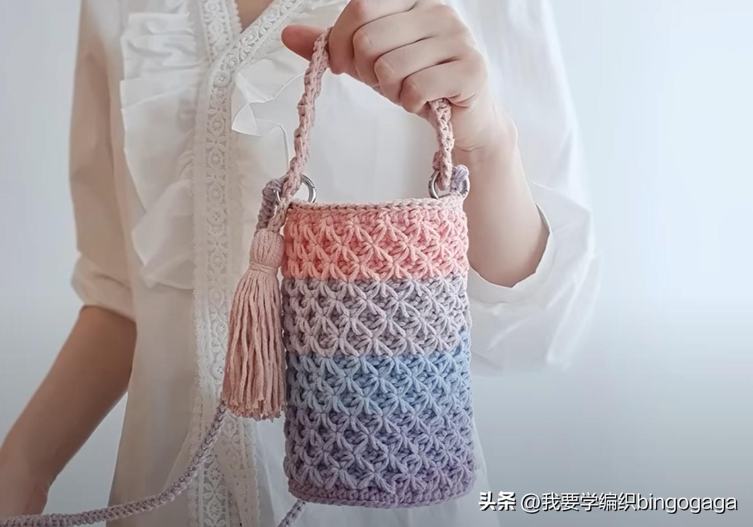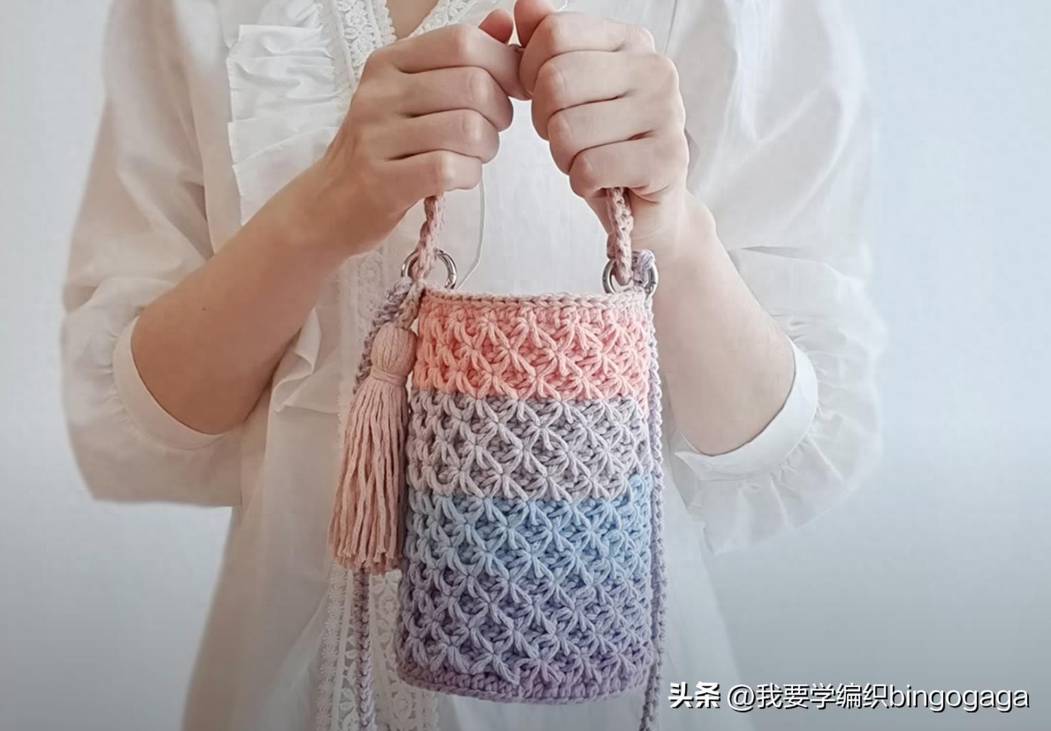 第3行:1锁翻面,钩一行短针(每个花样3针,每组第1个辫子针是跳过不钩的,钩的是花样处连着的3针),断线。长包带钩的是虾绳,大约钩了100厘米的长度,再将它的两头缝上包环,将短提手也穿入包环中;最后将包环扣到包包的两侧,再做一个穗当做挂饰,好啦,这款漂亮的蝴蝶蜂窝花迷你筒包就完工啦~!