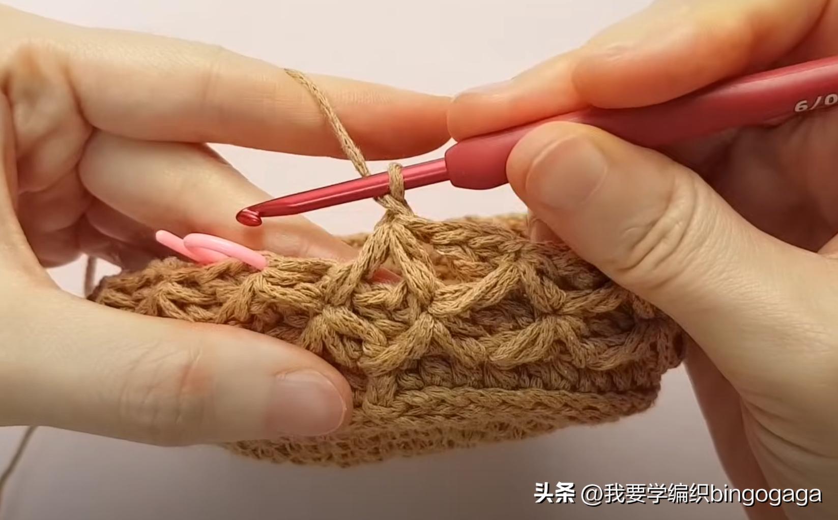 接着开始钩包身部分,注:包底钩完后总针数需要是3的倍数。第1圈:2锁,也是挑辫子针后面的小横杠钩一圈中长针,最后引拔;第2圈:先拉长线圈,在第1针上钩1针未完的中长针,再隔2针,下1针上钩1针未完的中长针,一次性引拔,锁1针,再从后面穿入跳过的2针依次钩出2针长针;后面就重复(将上一组花样的最后1针,隔2针,与下1针钩中长针2并1,锁1针,再从后面穿入跳过的2针钩出2长)钩至行末;注:最后一组隔2针后,是穿入第1针的位置钩出中长针2并1,最后与第1组花引拔。